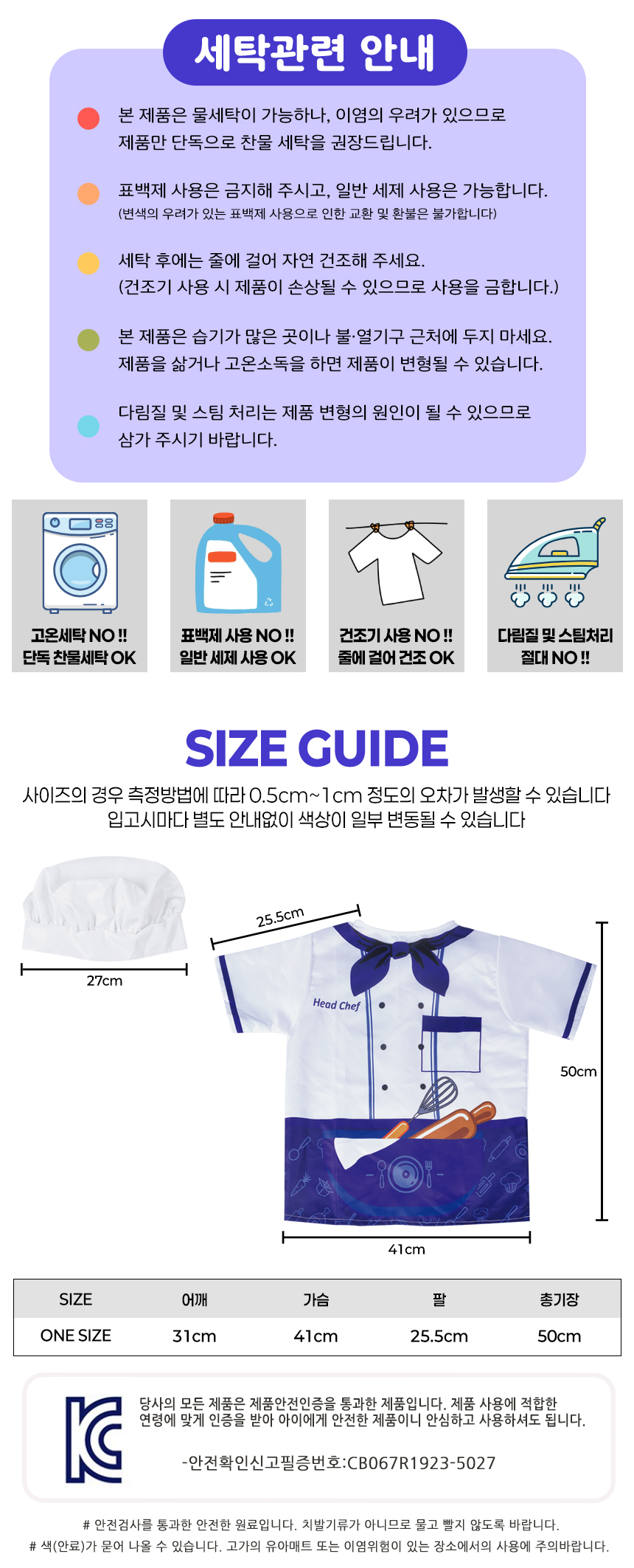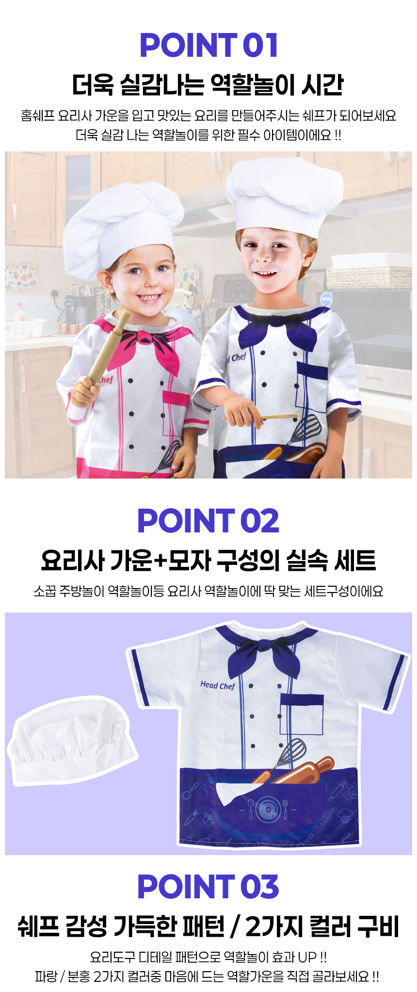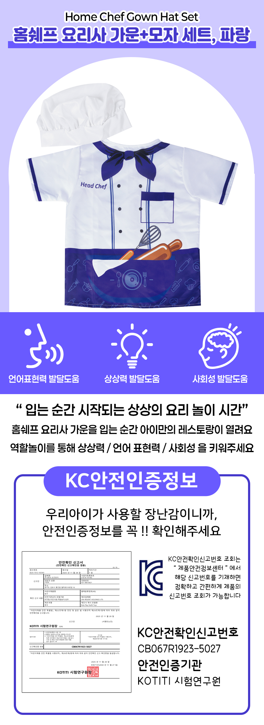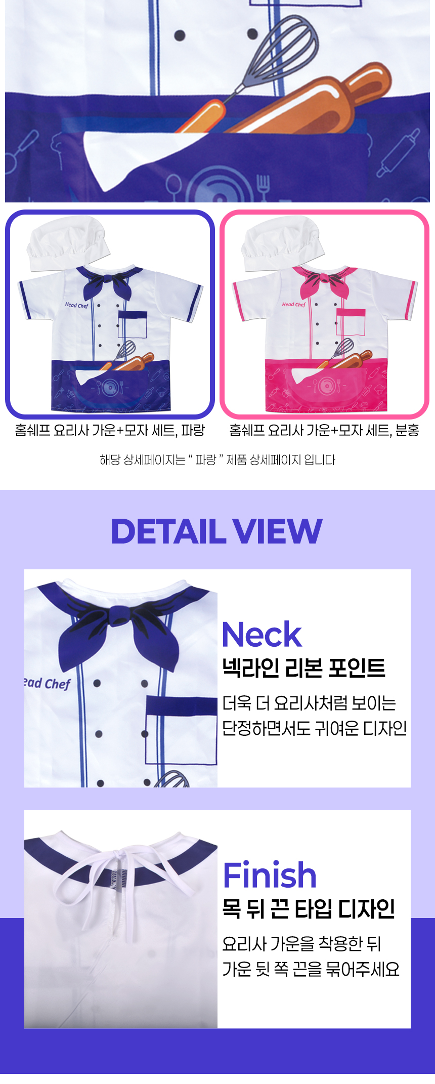 T 홈쉐프 요리사 가운+모자 세트 파랑 158-1 blue 직업 주방 소꿉 놀이 체험 의상 조끼 교구